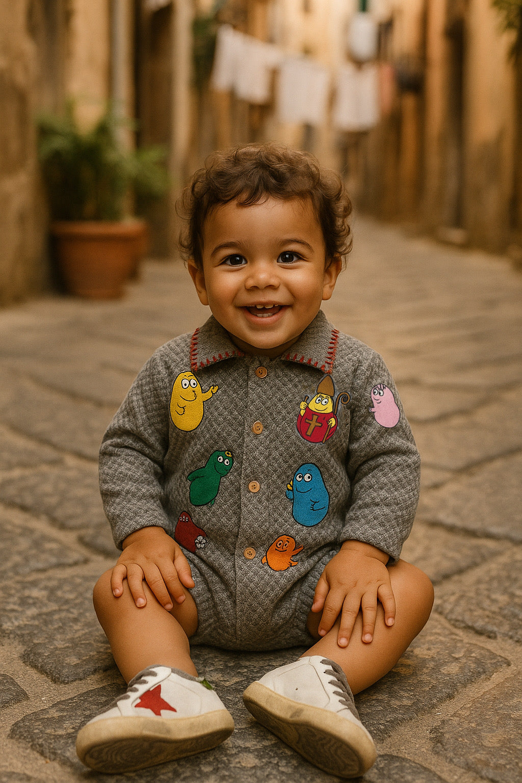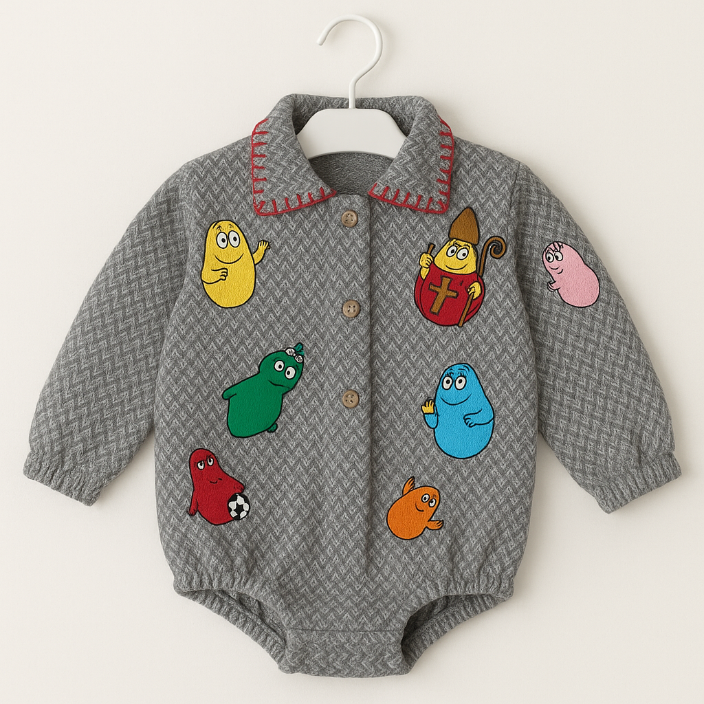 Un capo unico che unisce tradizione e creatività partenopea. Questo body a maniche lunghe è realizzato in morbido tessuto grigio con motivo spigato e presenta una chiusura frontale con bottoncini in legno. Il colletto è arricchito da un dettaglio ricamato a contrasto in rosso, che dona un tocco artigianale e originale.