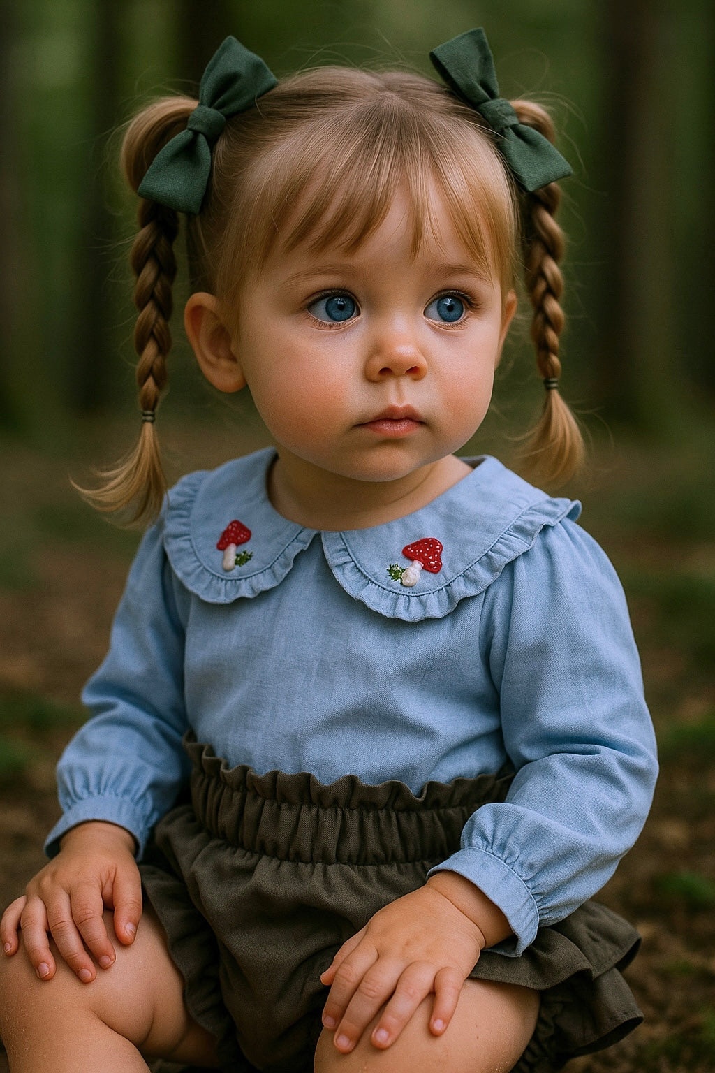 - Dettagli: colletto tondo con volant e ricami di funghetti rossi