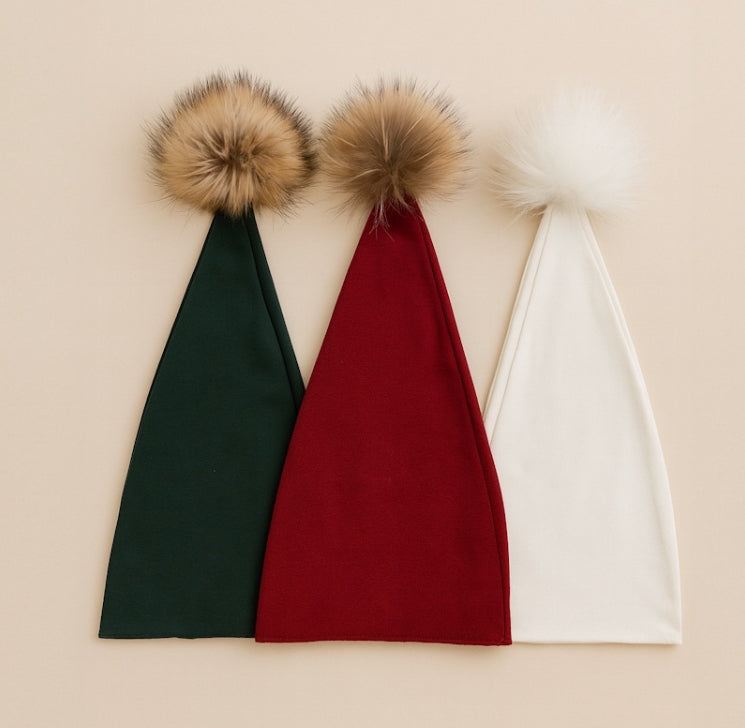 cappellini natalizi a punta, realizzati in morbido jersey a tinta unita e impreziositi da un pon pon in eco-pelliccia estremamente soffice e voluminoso.