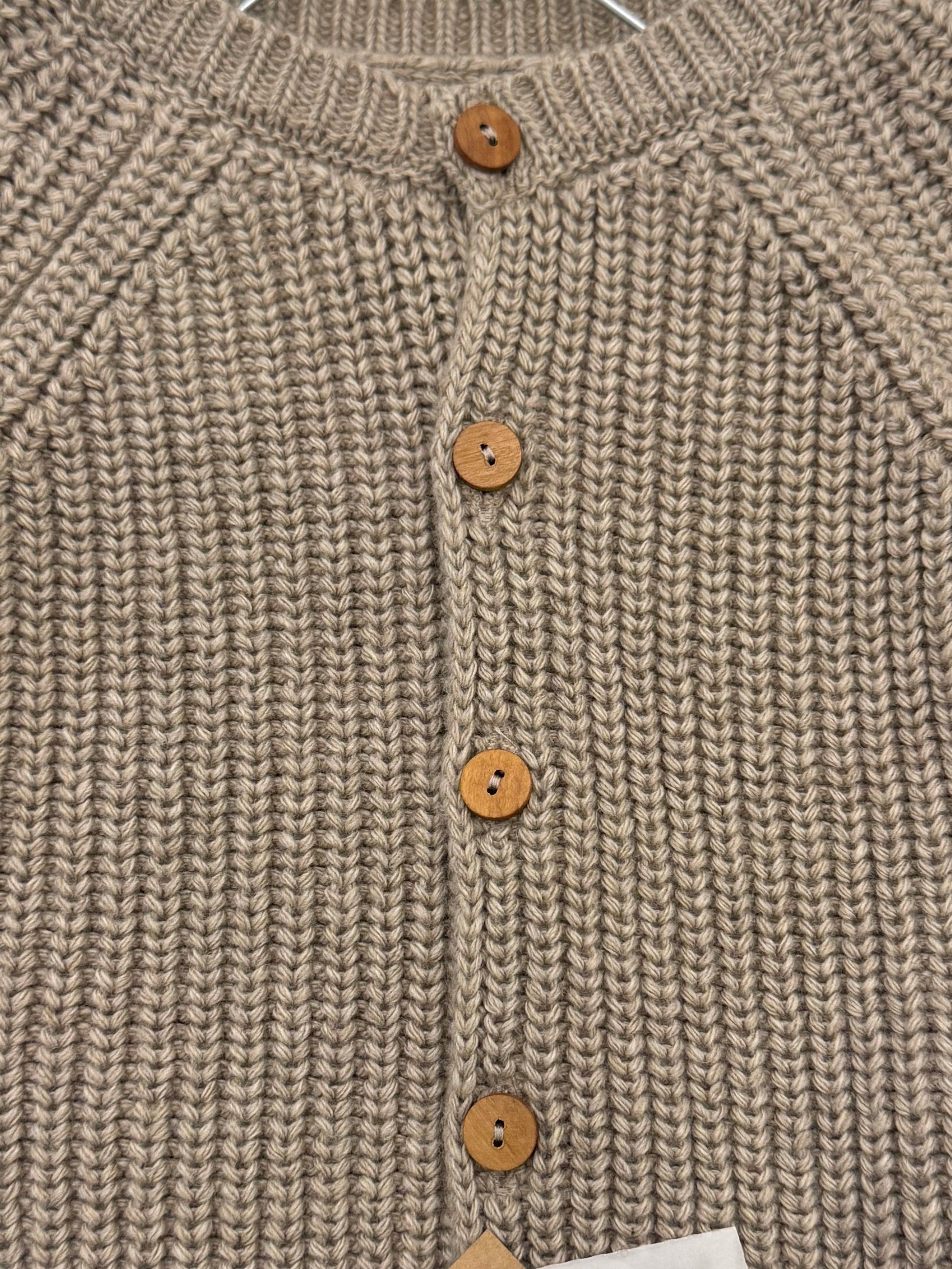 Questo cardigan in maglia è un capo caldo e avvolgente, perfetto per i primi freddi. Realizzato con filato spesso e soffice, presenta una lavorazione a maglia inglese che dona volume e morbidezza al tatto. Il modello ha maniche raglan per un comfort maggiore e una vestibilità comoda, ideale per i bambini.