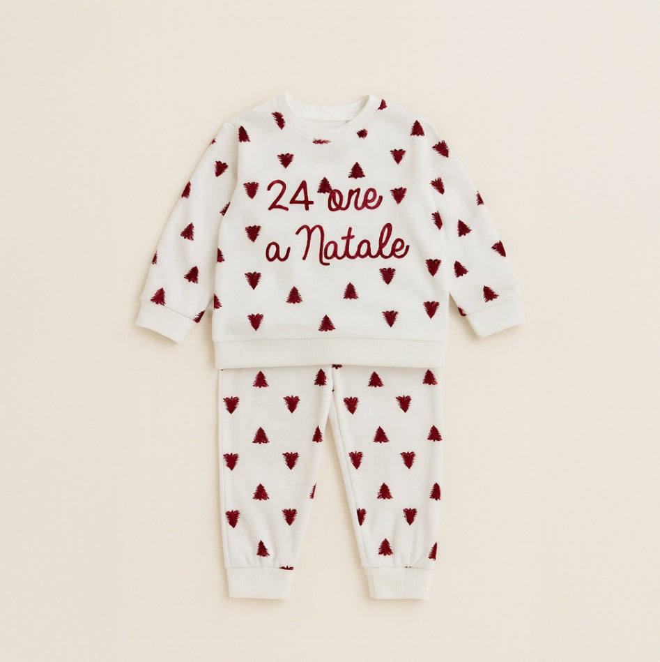 Realizzato in morbido cotone felpato color panna, è decorato da un dolce pattern di alberelli rosso bordeaux ricamati che donano un tocco festivo ed elegante. La felpa presenta la scritta “24 ore a Natale” in ricamo tridimensionale, perfetta per celebrare il conto alla rovescia più emozionante dell’anno.