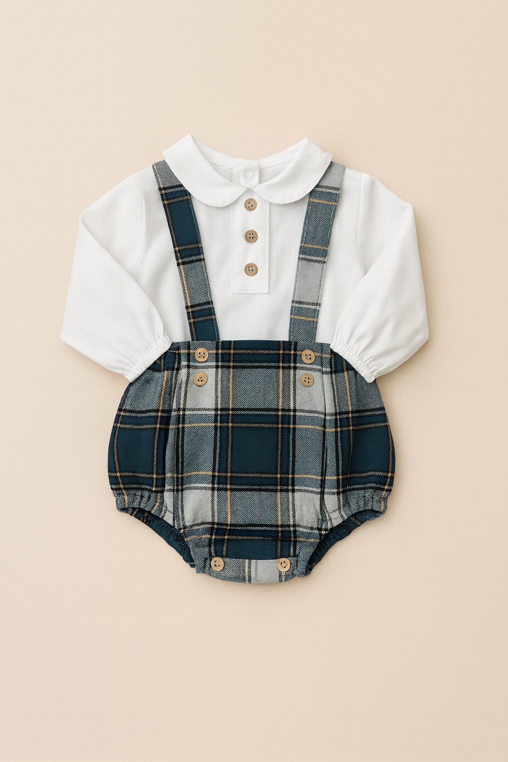 Un completo raffinato e senza tempo composto da camicina panna con colletto tondo e bottoncini in legno, abbinata a un pagliaccetto con bretelle in tartan verde petrolio e grigio. Il tessuto morbido e caldo e l’elastico sulle coscette assicurano comfort e libertà di movimento, mentre le bretelle decorative e i bottoni frontali donano un’eleganza classica irresistibile.