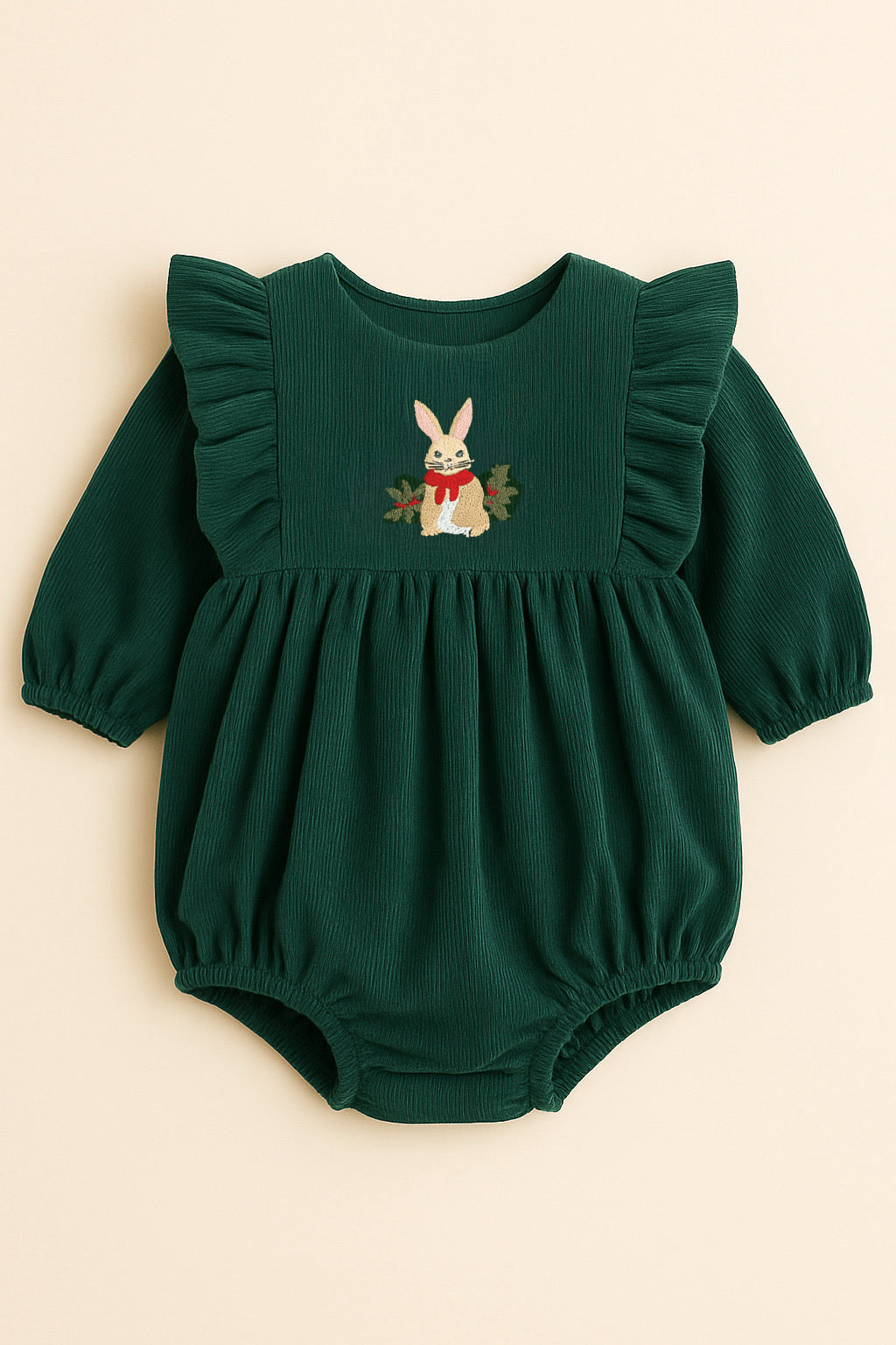 Al centro, il dolcissimo ricamo del coniglietto con dettagli natalizi aggiunge un tocco fiabesco e artigianale che rende il capo unico.