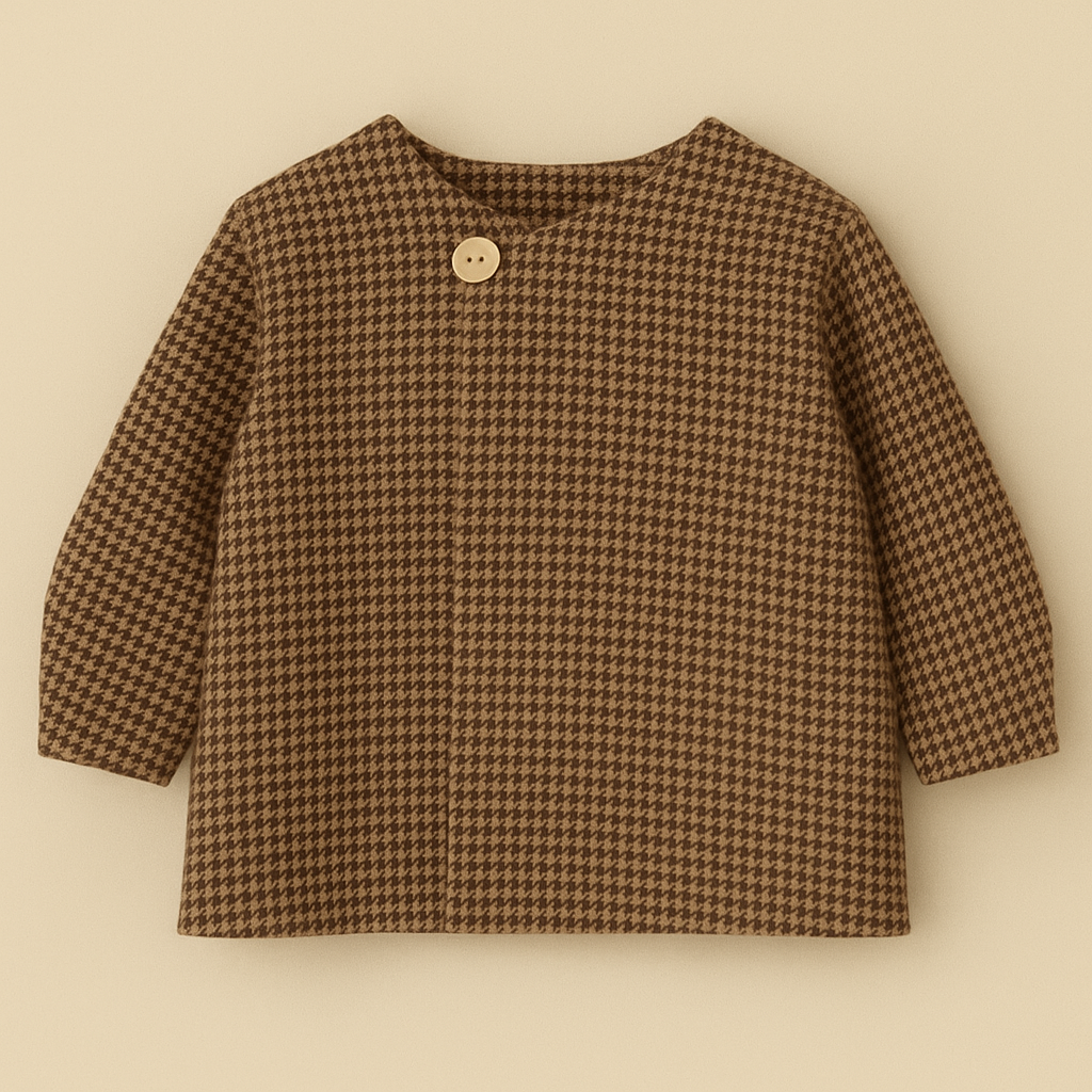 Realizzata in morbido tessuto pied de poule nei toni del marrone e bordeaux, questa giacca è il perfetto equilibrio tra semplicità e stile artigianale.