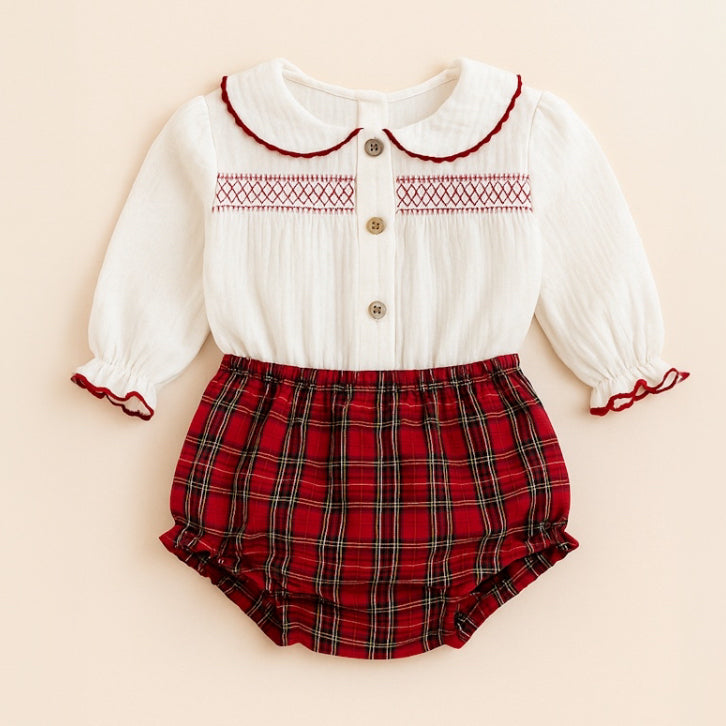Un delizioso romper natalizio pensato per le feste più dolci dell’anno. La parte superiore, in morbida mussola color panna, presenta un elegante colletto tondo rifinito con piping rosso e ricamo smock coordinato sul petto. Le maniche lunghe con arricciatura leggera e piccolo volant donano un tocco romantico e raffinato.