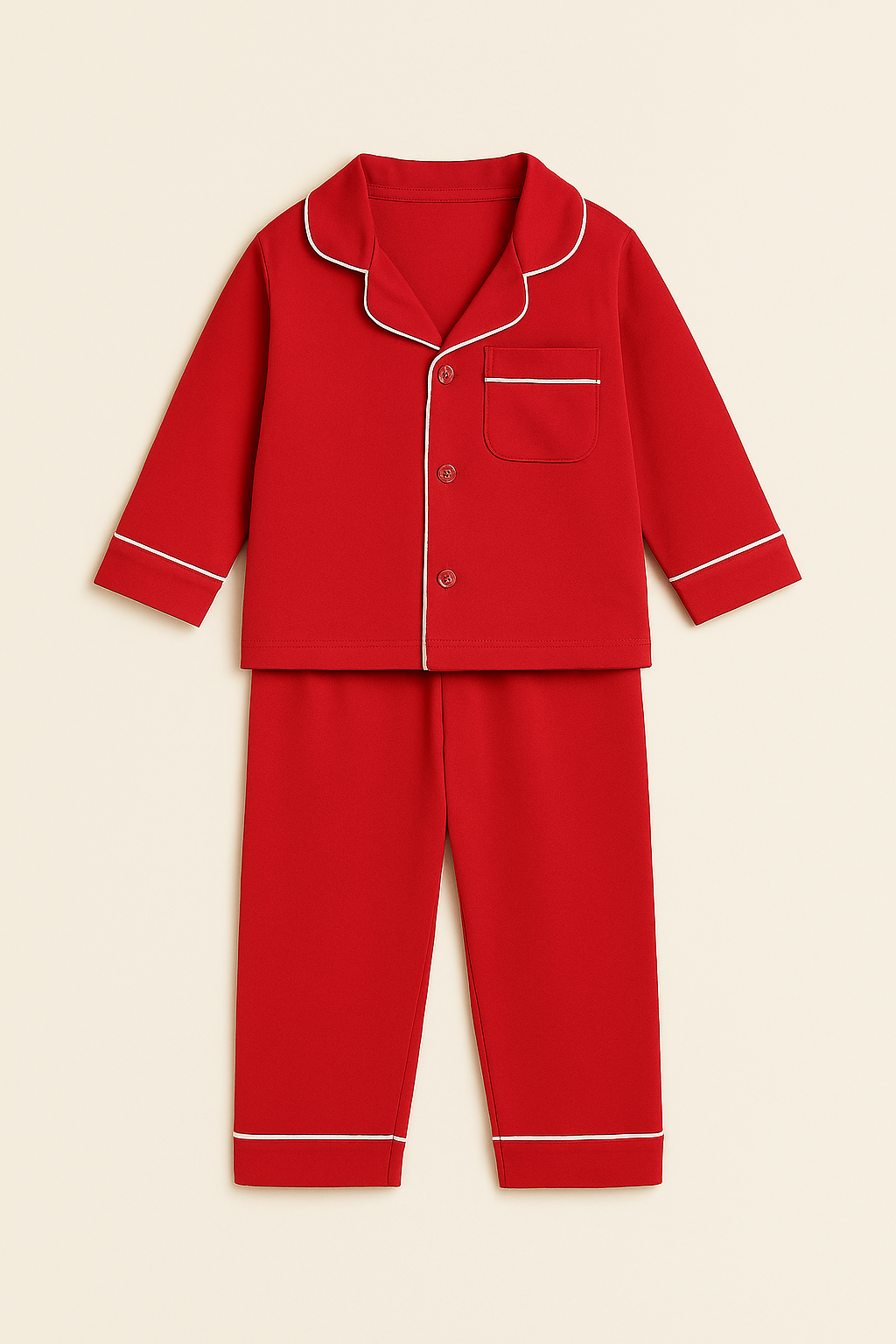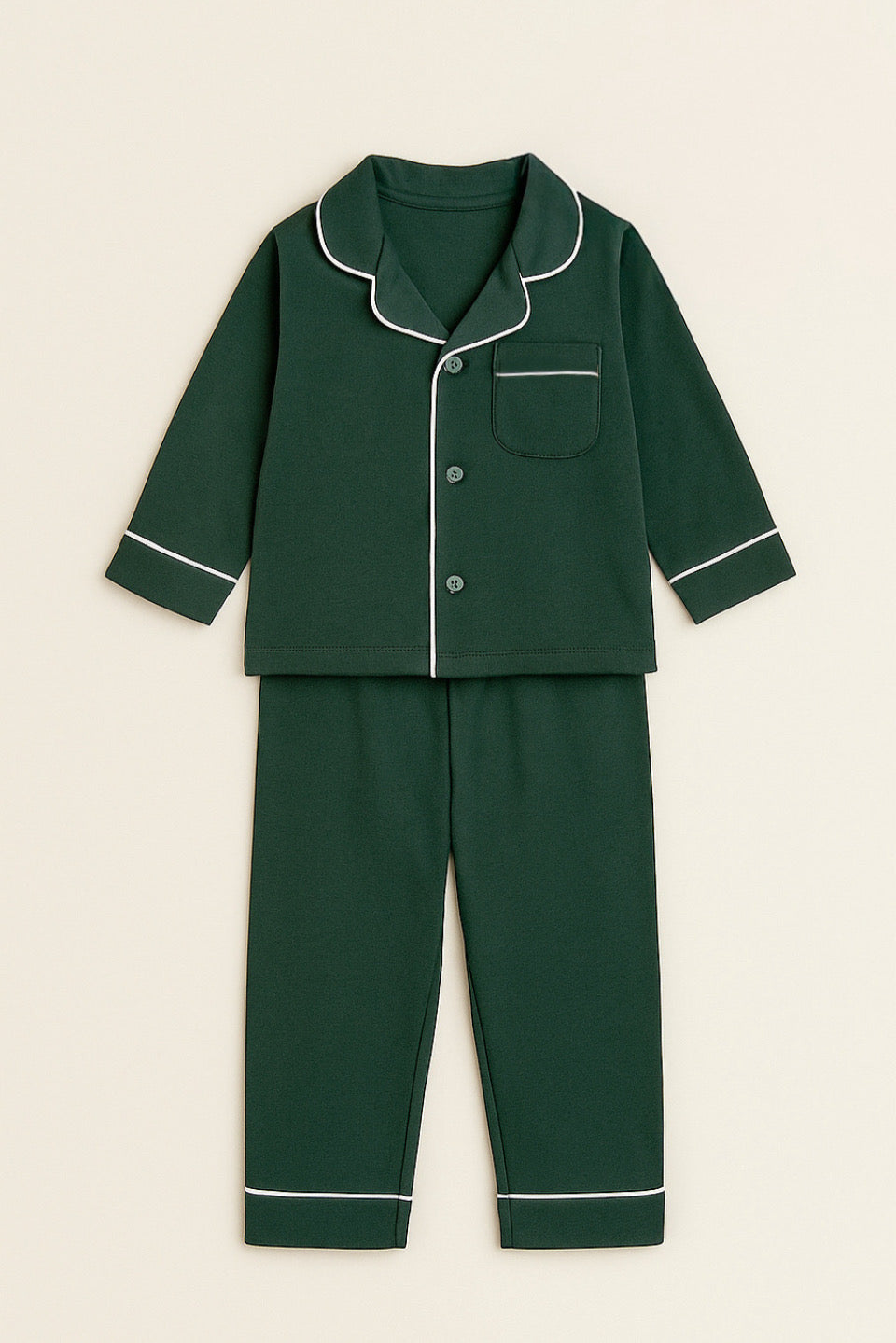 Questo pigiama per bambini è composto da due pezzi: una camicia a maniche lunghe e un pantalone lungo, entrambi realizzati in un tessuto di colore verde bosco intenso.
