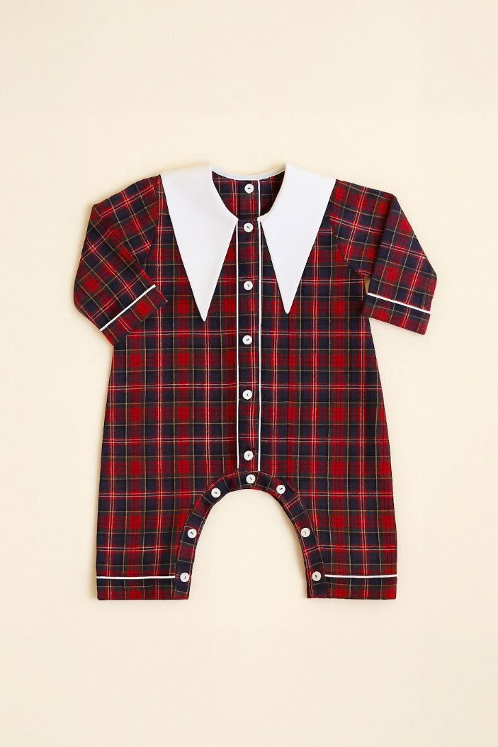 Elegante romper in flanella tartan rosso e blu, ispirato allo stile classico inglese. Il modello presenta un ampio colletto bianco a punta, maniche lunghe con profilo in contrasto e chiusura frontale con bottoncini madreperlati fino al cavallo, per una vestibilità comoda e raffinata. Ideale per le feste o le occasioni speciali invernali, unisce il calore del tessuto scozzese al fascino senza tempo dei capi sartoriali per bambini.