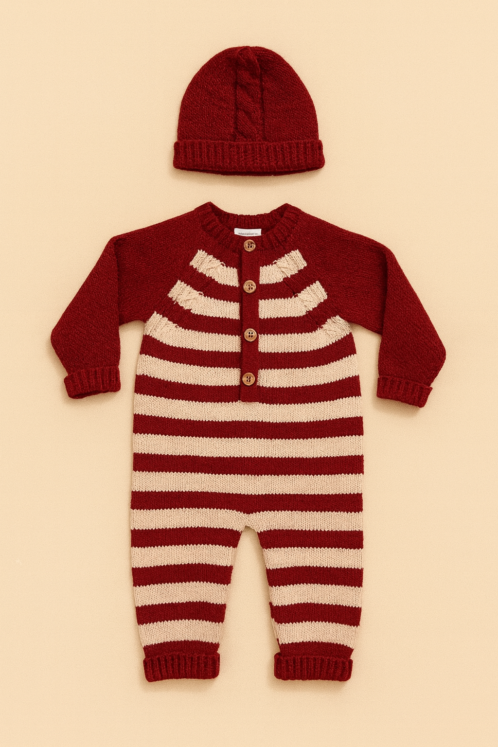 Deliziosa tutina in maglia lavorata a mano dallo stile caldo e intramontabile. Il corpo è caratterizzato da una fantasia a righe rosso intenso e panna, che dona un look elegante e festivo perfetto per l’inverno. Il modello presenta maniche lunghe in tinta unita, polsini a coste e un’abbottonatura frontale con bottoni in legno che rende la vestibilità pratica e comoda.