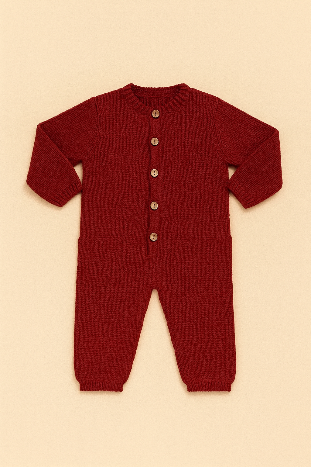 Tutina in maglia dal design essenziale e intramontabile, realizzata in un caldo filato rosso rubino perfetto per la stagione invernale. Il modello presenta maniche lunghe, polsini e caviglie a coste per una vestibilità avvolgente, insieme a una pratica abbottonatura frontale con bottoni effetto legno che facilita il momento del cambio.