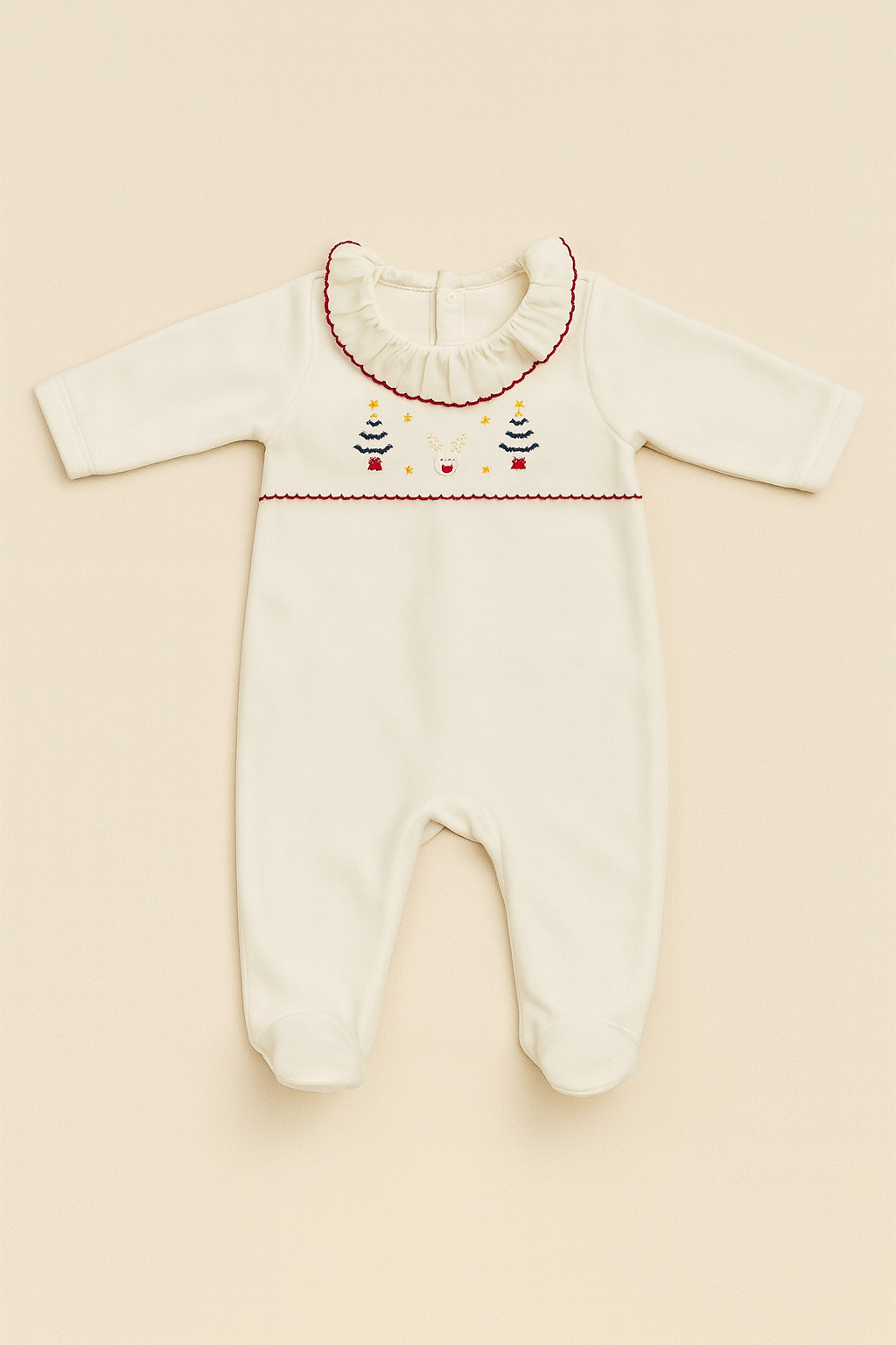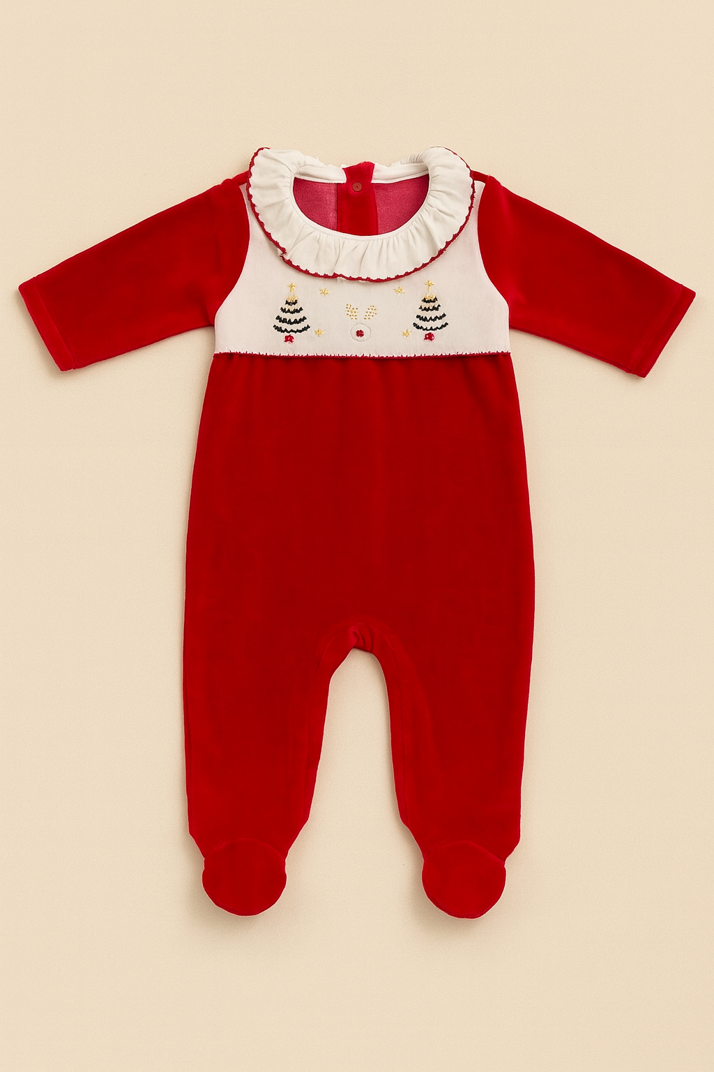Morbida tutina in ciniglia rosso vivo, ideale per avvolgere il bebè nel calore delle feste. Il corpino in contrasto color panna presenta un ricamo delicato con alberelli di Natale, stelline dorate e una piccola renna al centro, per un look tenero e festoso. Il colletto a volant con profilo rosso aggiunge un tocco romantico e curato.