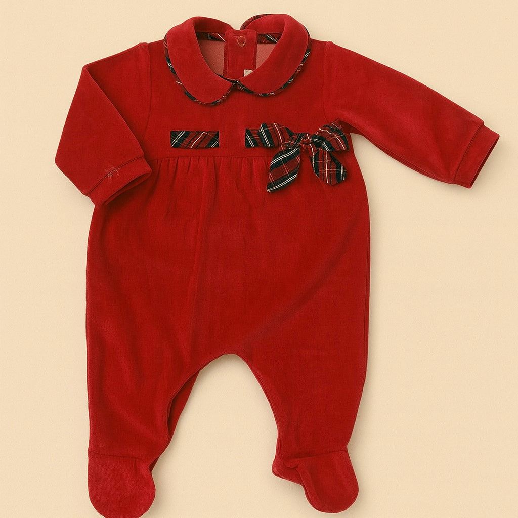 Morbida tutina in ciniglia rosso vivo, calda e avvolgente, ideale per il periodo delle feste. Il colletto tondo e i dettagli in tessuto scozzese — applicati sul petto e nel fiocco laterale — donano un tocco elegante e tradizionale, perfetto per l’atmosfera natalizia.