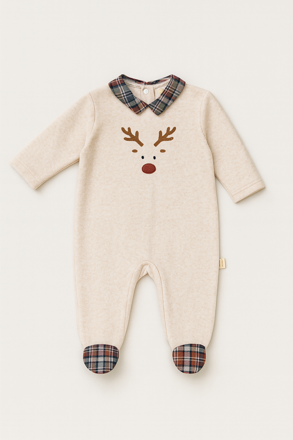 Morbida tutina in ciniglia color panna, calda e confortevole per accompagnare il bebè nei giorni più freddi. Sul davanti spicca un ricamo dolcissimo con il musetto di una renna dal nasino rosso, perfetto per l’atmosfera natalizia.